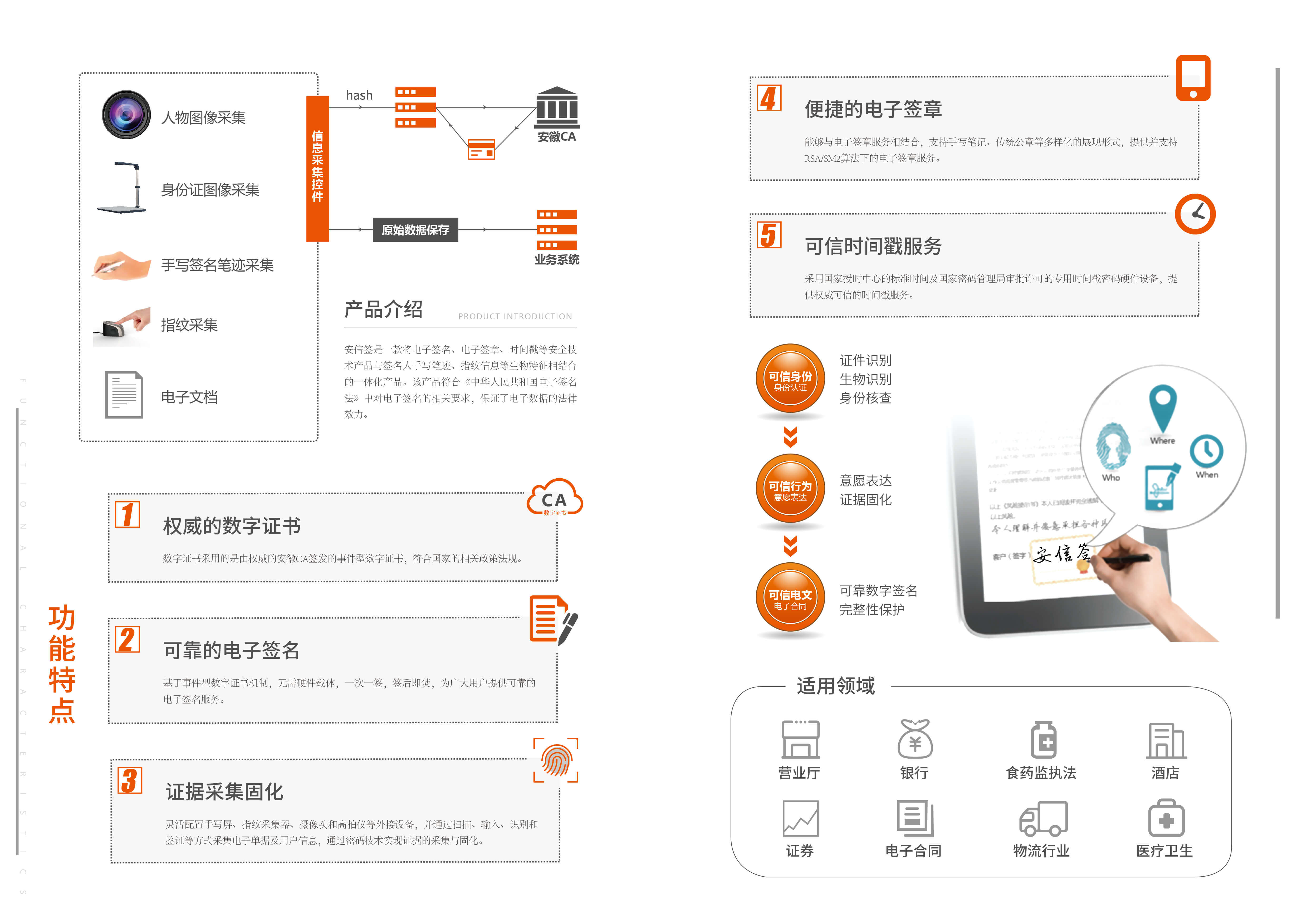 安信签是一款将数字签名、可信电子签章、时间戳等安全技术与签名手写笔记、指纹信息等生物特征相结合的一体化产品。 该产品遵循《中华人民共和国电子签名法》中有关“可信电子签名”相关要求,充分保障了电子数据的安全性、有效性,确保了电子数据的法律效力。可广泛用在医疗机构患者签名、无纸化营业厅、电子保单签署、政府窗口单位无纸化办公等多个签名场景中应用。